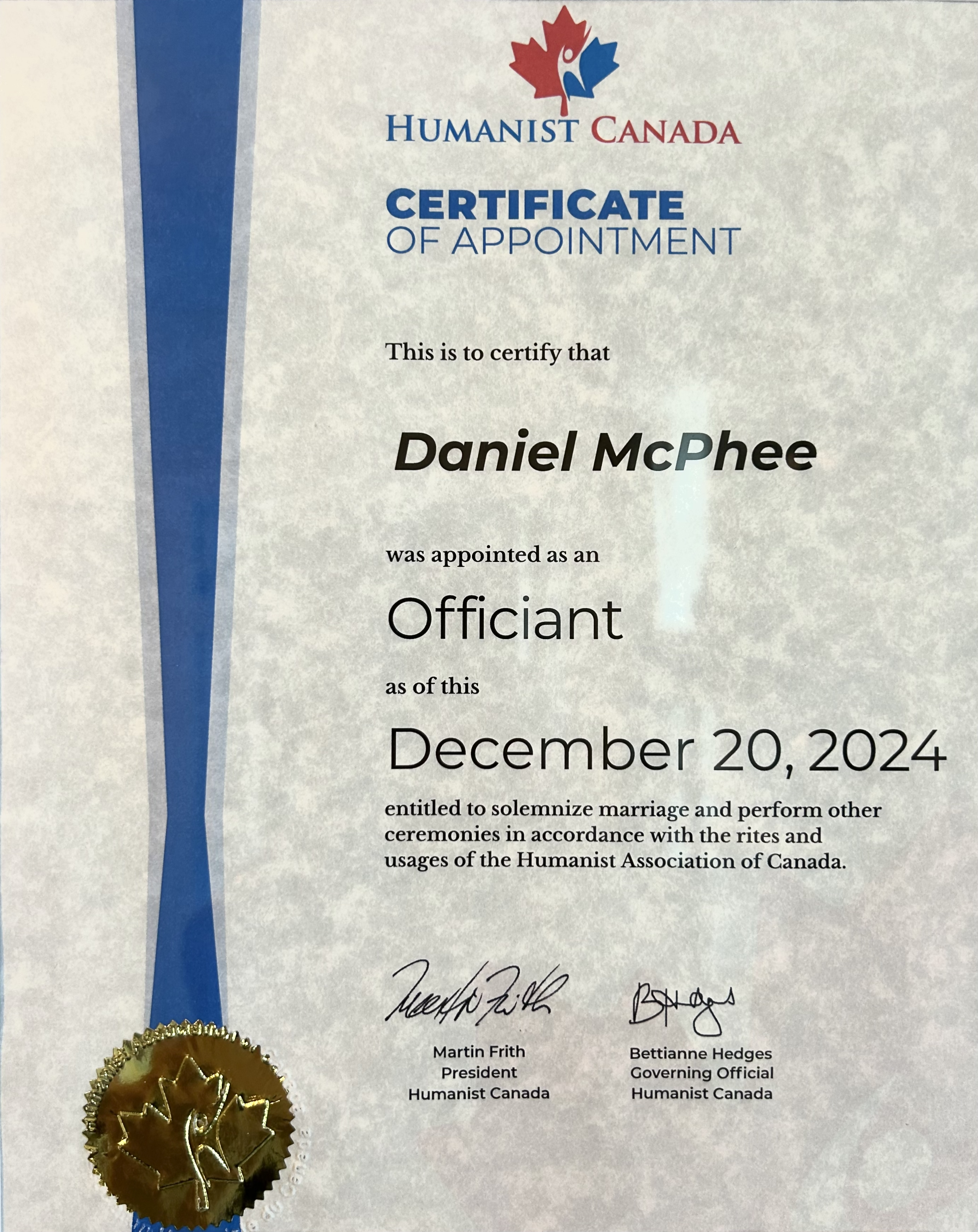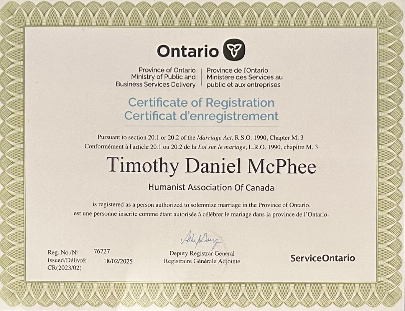 Registered as a person authorized to solemnize marriage in the Province of Ontario in accordance with the rites and usages of the Humanist Association of Canada.